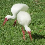 Eudocimus albus uses its long decurved bill, bright red in breeding season, to search for tasty (and lawn-damaging) arthropod grubs to eat.
