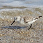 If last month’s bird (Ruddy Turnstone) was our “rocky” feeder, this month’s (Sanderling, Calidris alba), is our “sandy-shore” bird. It’s also our baseline sandpiper, of medium size, one we can use for reference when separating it from the smaller sandpipers (the “peeps”) in the genus Calidris. (Although separation is often not a problem—if there’s only one small shorebird at the beach when you visit, it’s probably this one.) Paying attention to feeding behavior is one of the quickest ways to ID a distant shorebird, and this bird’s habit of playing high-speed tag with the waves combined with quick pokes at the substrate in search of its small arthropod prey make it instantly identifiable. It doesn’t appear to want to get its belly wet—if it misjudges an incoming wave, it’ll take flight rather than get wet (or bowled over). When it flies, you’ll see a bright stripe standing out in stark contrast to the otherwise dark wings. If you’re close enough to make out any type of color, the combination of pale white underparts (recall the specific epithet, alba, which means “white”) and light gray uppers are also a dead giveaway. Most individuals also carry a characteristic “shoulder smudge” that helps cement the ID. It has dark legs, although they’re frequently just a blur of motion. In size, it’s compact, but chunkier and larger than the “peeps,” (the five smallest members of this genus). It has a dark, straight, stout, almost cylindrical bill, with a slight “bulb” near the tip. In Palm Beach County, sanderlings are common on sandy beaches in all seasons except summer, when they are largely absent.