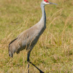 Although technically a wetland bird, the Sandhill Crane can just as often be encountered in upland habitats like grasslands and prairies. These large birds are the size of our Great Blue Heron, but, unlike herons and egrets, cranes keep their necks extended rather than curled into the s-shape of the Ardeidae, and their black bills are substantially thinner and shorter. They are very large, pale silver and gray birds with long, black legs and a red patch on the crown that stands out against a white cheek. They also have unique “curved” feathers at the rump, often called a bustle.